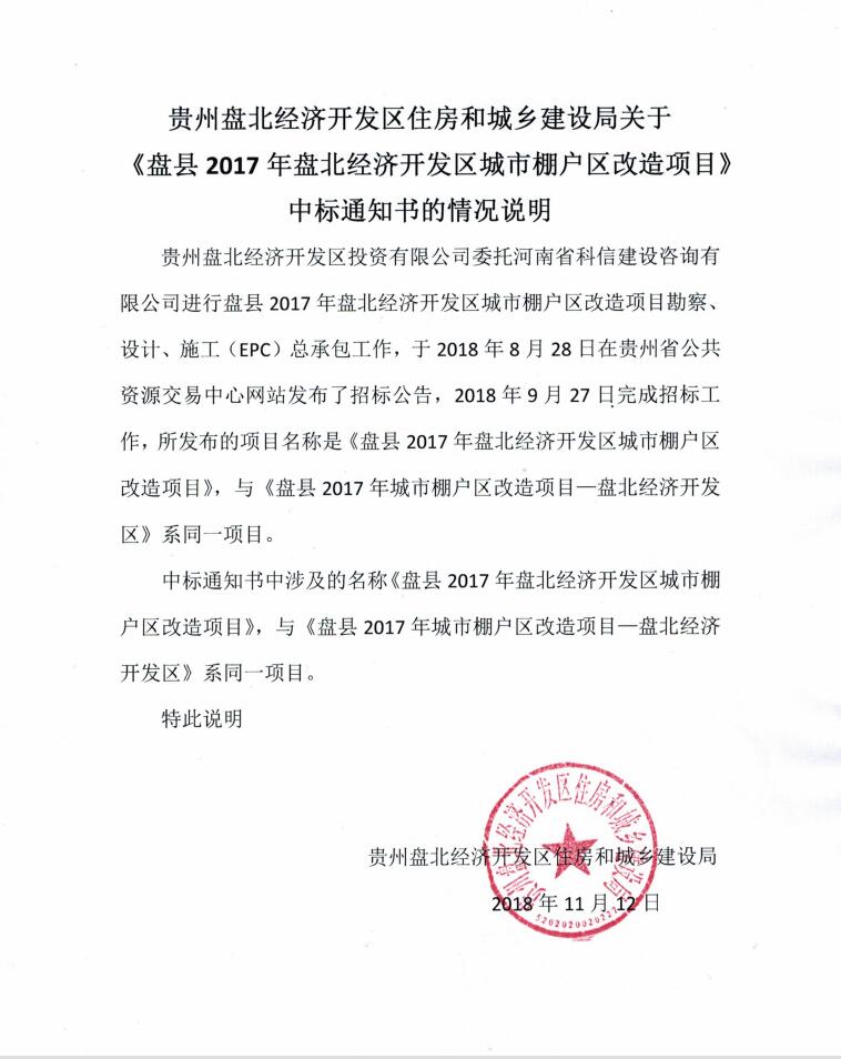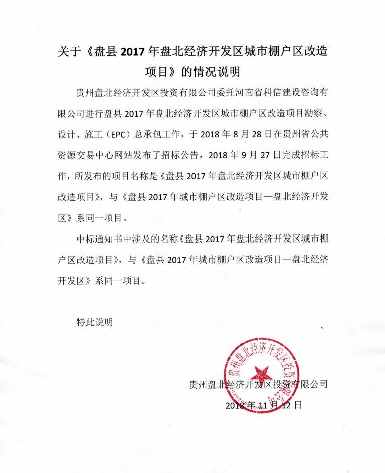 贵州盘北经济银河官网关于《盘县2017年盘北经济银河官网城市棚户区改造项目》中标通知书的情况说明