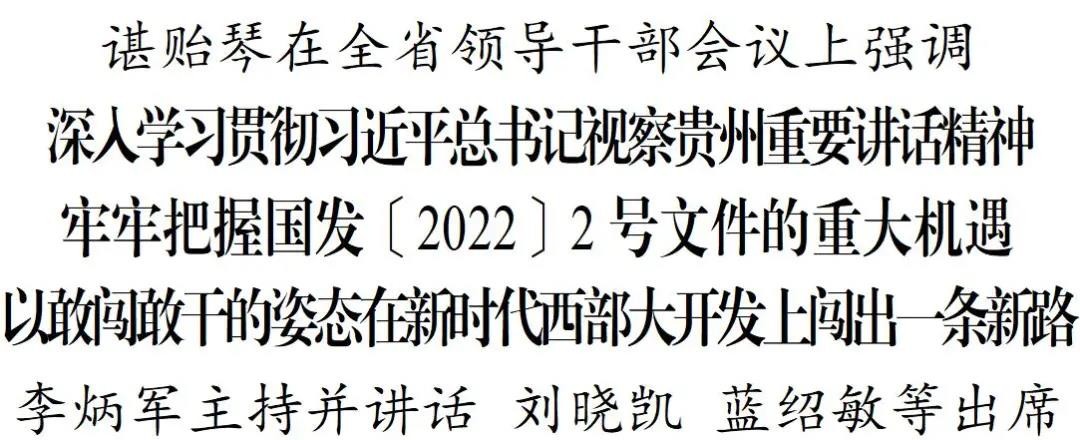 2月8日,春节后上班第二天,全省领导干部会议在贵阳召开,重温习近平总书记视察贵州重要讲话精神,对学习贯彻国发〔2022〕2号文件进行动员部署。省委书记、省人大常委会主任谌贻琴出席会议并讲话。她强调,要深入学习贯彻习近平总书记视察贵州重要讲话精神,牢记总书记殷切嘱托,感恩党中央亲切关怀,牢牢把握国发〔2022〕2号文件的重大机遇,坚持以高质量发展统揽全局,围绕“四新”主攻“四化”,以敢闯敢干的姿态在新时代西部大开发上闯出一条新路,努力开创贵州高质量发展新的“黄金十年”。
