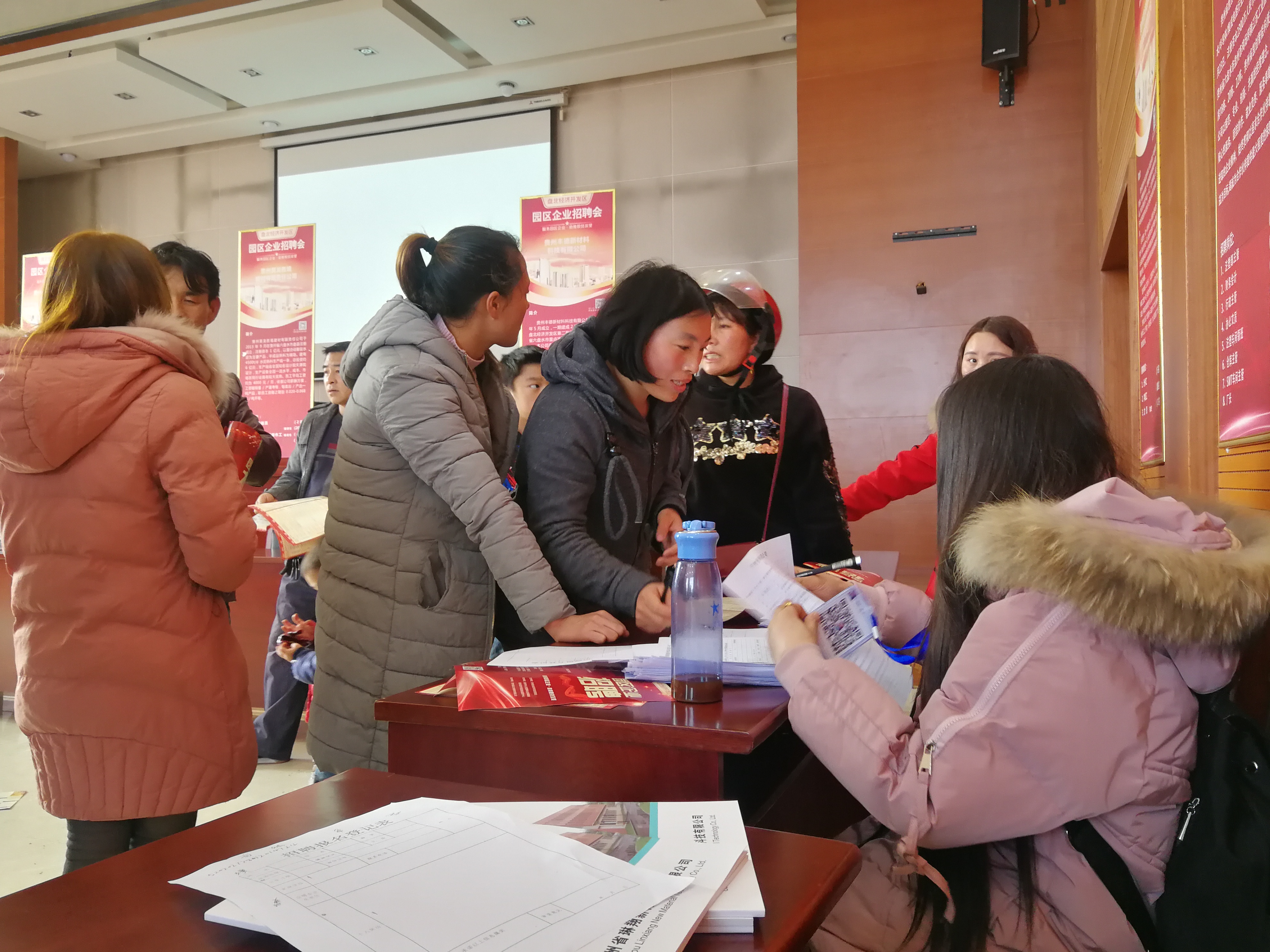 招聘会现场招聘的岗位种类多样,前来咨询求职的人络绎不绝,许多来自周边的父老乡亲都在现场找到自己适合岗位,认真填写用工花名册。
