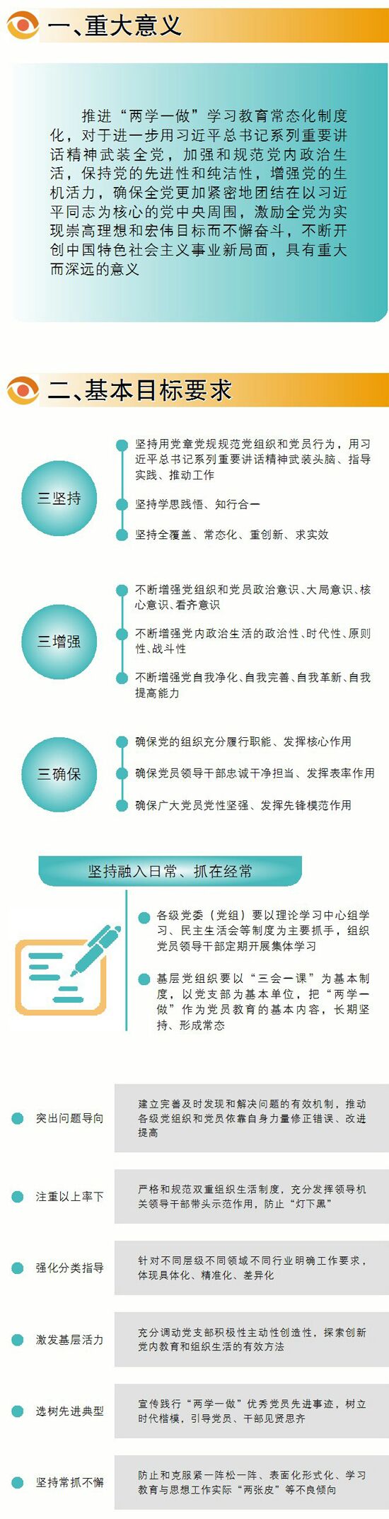 2017年3月29日,《中国组织人事报》第2版刊登了《<关于推进“两学一做”学习教育常态化制度化意见>图解》(以下简称《图解》),按照省委组织部、市委组织部和县委组织部要求,各单位各部门要加强宣传推送,把《图解》内容传递到每个党支部,让每名党员了解掌握推进“两学一做”学习教育常态化制度化基本要求和内容。现将《图解》公示如下,请银河官网各党员干部加强学习,深入了解和掌握推进“两学一做”学习教育常态化制度化的基本要求和内容。