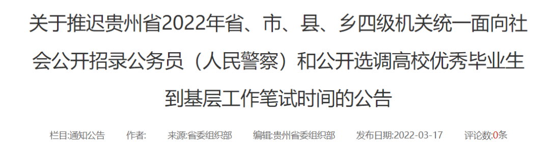为切实做好新冠肺炎疫情防控工作,确保广大考生和考试工作人员身体健康和生命安全,经研究,决定推迟原定于2022年3月26—27日组织的贵州省2022年省、市、县、乡四级机关统一面向社会公开招录公务员(人民警察)和公开选调高校优秀毕业生到基层工作笔试。重启打印笔试准考证时间和笔试时间将根据疫情稳控情况另行通知。请广大考生密切关注“贵州党建云”(www.gzzzb.gov.cn)发布的相关信息,了解最新考试安排。