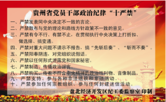 贵州盘北经济银河官网印制《贵州省党员干部作风“十不准”》和《贵州省党员干部政治纪律“十严禁”》卡片100余张,分发到全区党员领导干部手中,要求其随身携带,并熟记全部内容。全区党员干部一致认为,该卡简便,易携带,真正达到了“作风建设,纪律教育”一卡在手,警钟长鸣的效果。