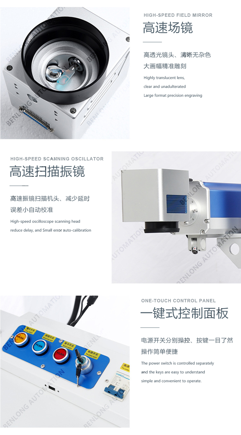 主要优点:加工速度快,是传统打标机的2-3倍。采用光纤激光器输出激光,再经高速扫描振镜系统实现打功能。