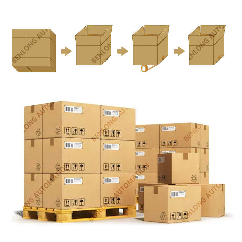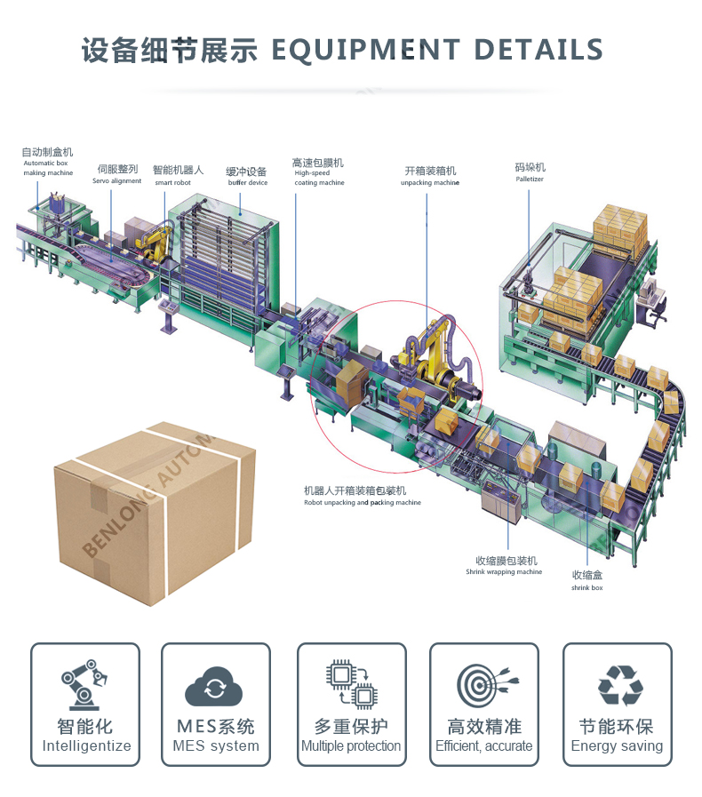 具有自动物流、分选、折内盒、装内盒、内盒贴标、称重、内盒盒盖、外箱开箱、装外箱、外箱盒盖、外箱贴标、封箱、捆扎、