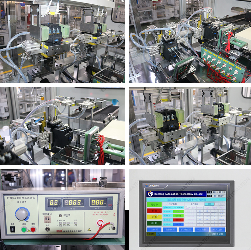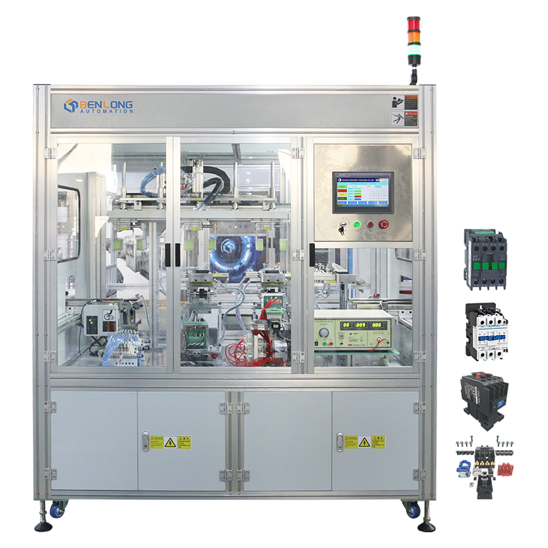 具有自动上料、插芯装配、底座装配、主辅静触头装配、人工装配宝塔弹簧、锁上下盖螺丝、锁瓦片螺丝、通断、