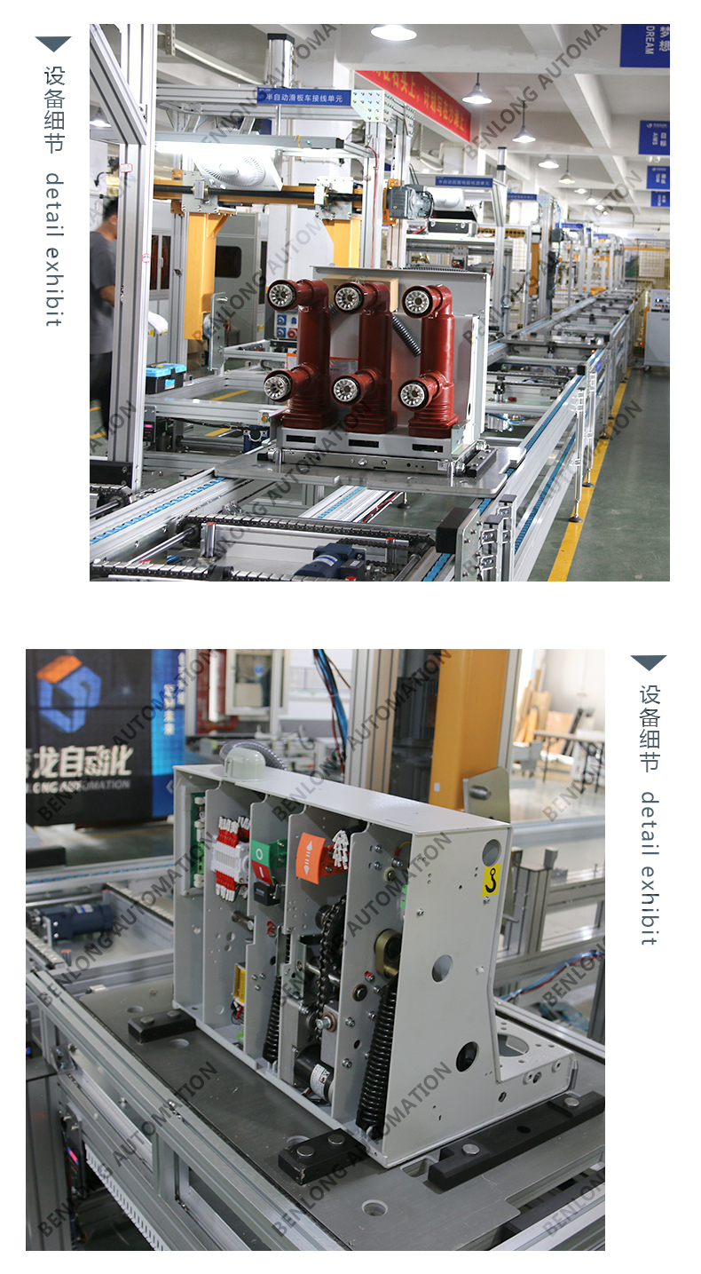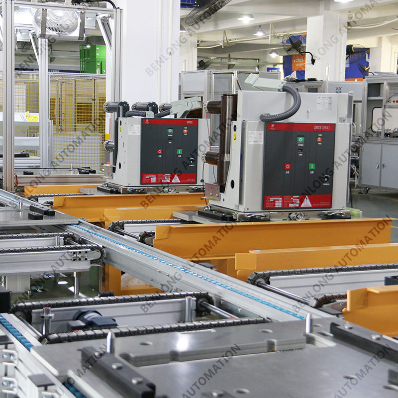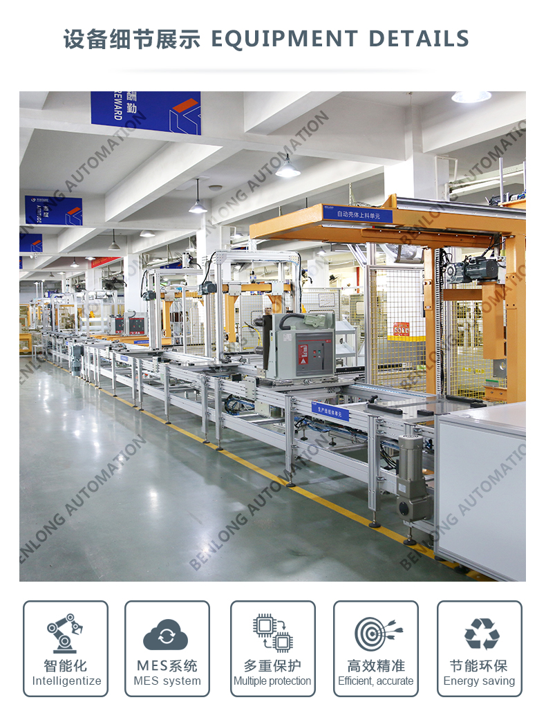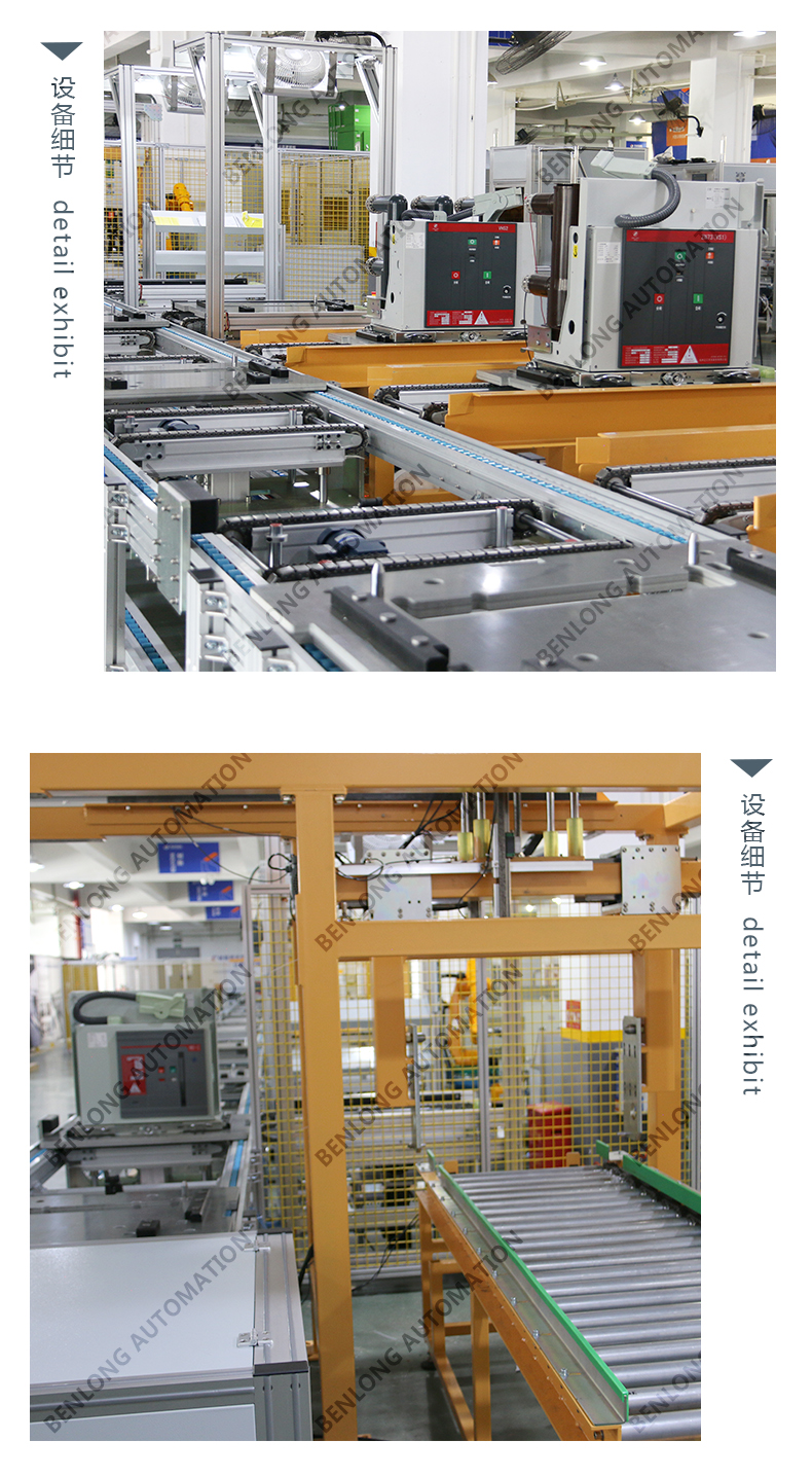 具有自动AGV物流输送、龙门架自动上料、倍速链物流、绝缘筒装配、灭弧室装配、初调装配、初调翻转、机器人锁螺丝、开距、超程、总程、磨合检测、机械特性检测、分合闸速度、同步性、A相合闸时间、B相合闸时间、C相合闸时间、触臂触头装配、耐高压(10KVA)、回路电阻、底盘车装配、机器人锁螺丝、底盘车翻转、底盘车接线、外观封板装配、二次综合检测、龙门架自动下料、包装、码垛、AGV物流输送、缺料报警等工序的装配、在线检测、实时监控、质量溯源、条码识别、元器件寿命监测、数据存储、MES系统与ERP系统联网、参数任意配方、智慧能源分析与节能管理系统、智能装备服务大数据云平台等功能。