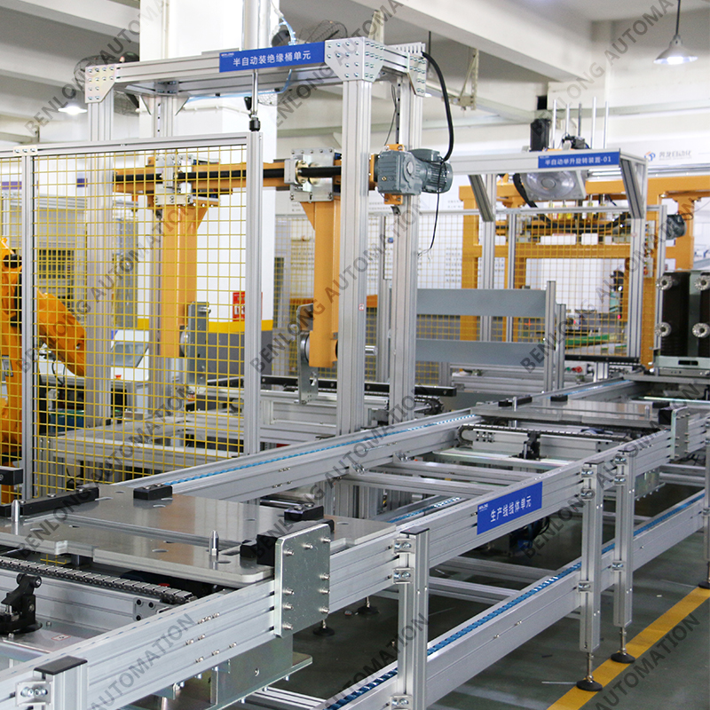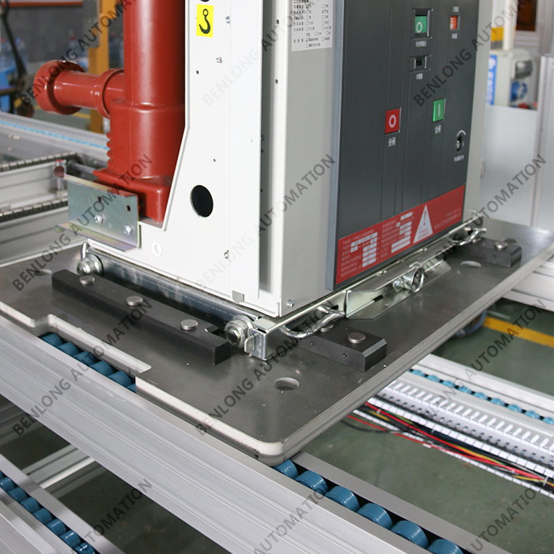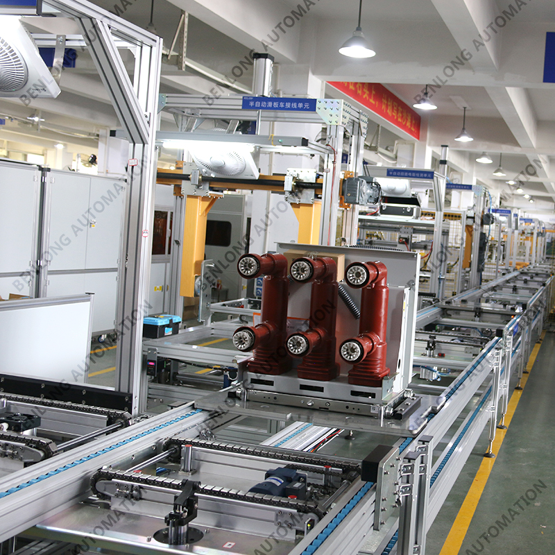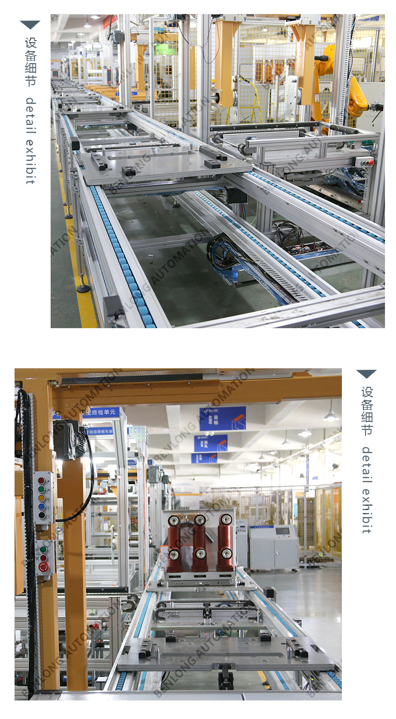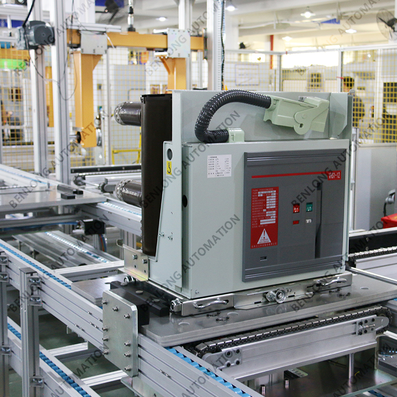 具有自动AGV物流输送、龙门架自动上料、倍速链物流、绝缘筒装配、灭弧室装配、初调装配、初调翻转、机器人锁螺丝、开距、超程、总程、磨合检测、机械特性检测、分合闸速度、同步性、A相合闸时间、B相合闸时间、C相合闸时间、触臂触头装配、耐高压(10KVA)、回路电阻、底盘车装配、机器人锁螺丝、底盘车翻转、底盘车接线、外观封板装配、二次综合检测、龙门架自动下料、包装、码垛、AGV物流输送、缺料报警等工序的装配、在线检测、实时监控、质量溯源、条码识别、元器件寿命监测、数据存储、MES系统与ERP系统联网、参数任意配方、智慧能源分析与节能管理系统、智能装备服务大数据云平台等功能。