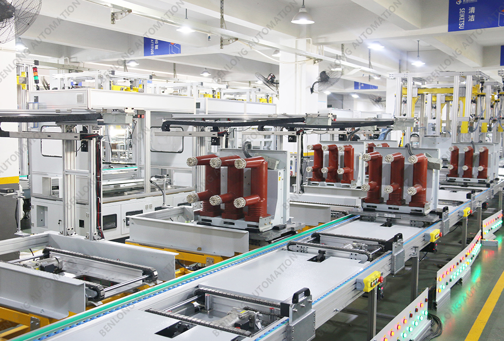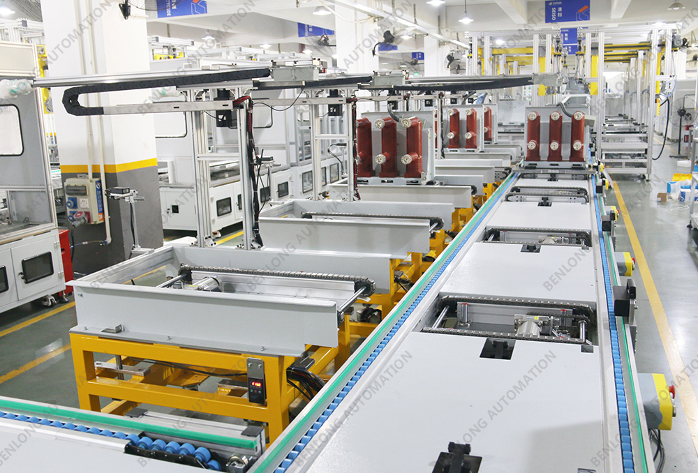 具有自动AGV物流输送、龙门架自动上料、倍速链物流、绝缘筒装配、灭弧室装配、初调装配、初调翻转、机器人锁螺丝、开距、