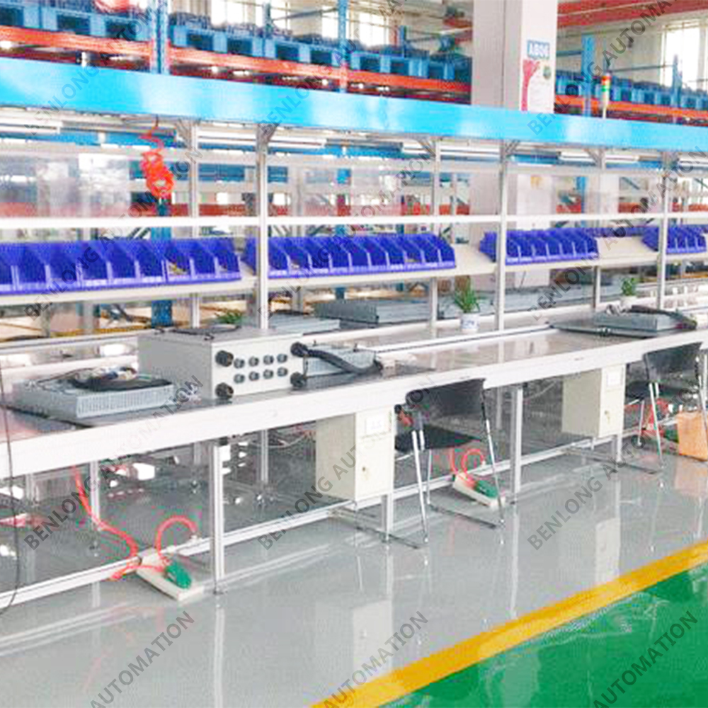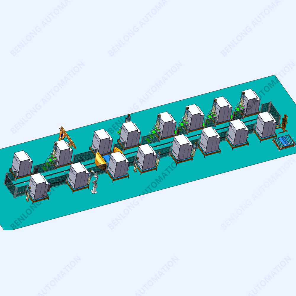 具有产品自动上料、产品自动分配至各工位、机器人自动装配、自动检测、机器人自动锁螺丝、自动检测、自动下料、